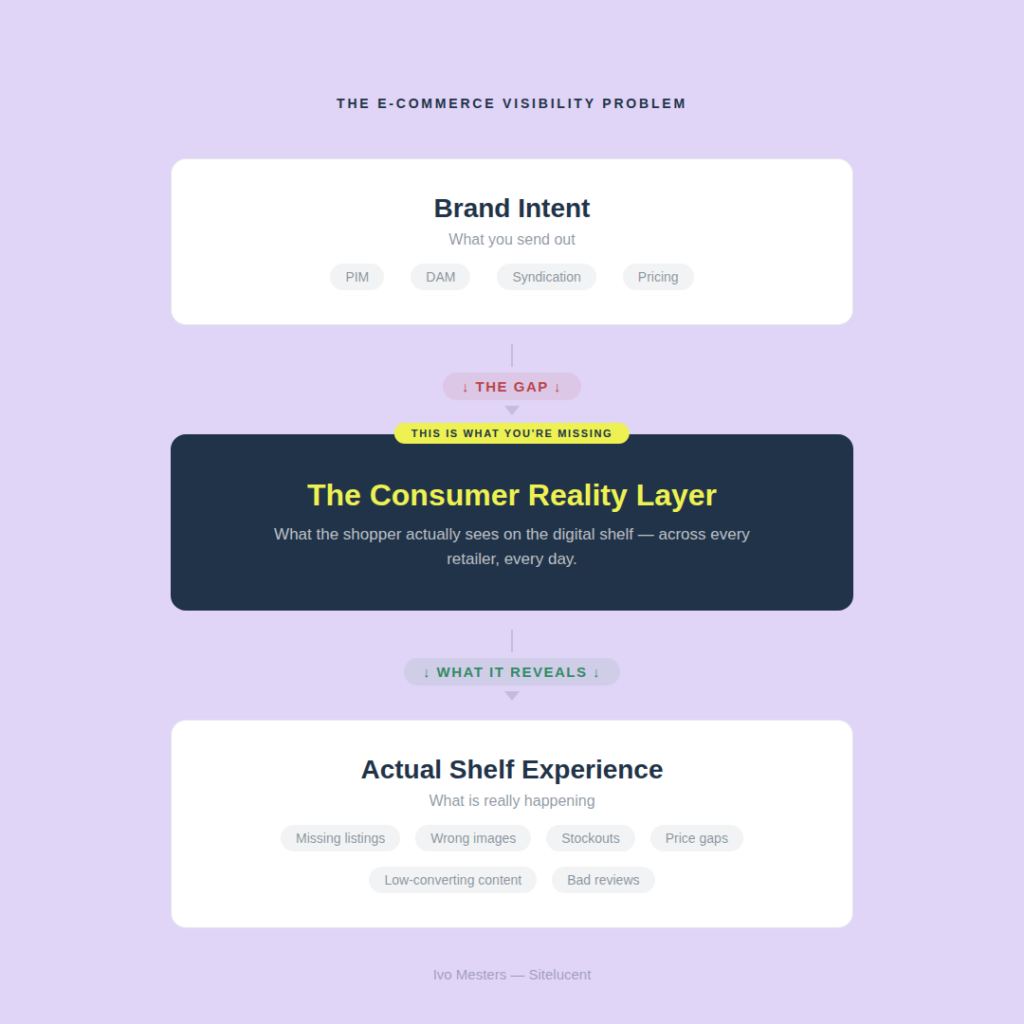But these systems mainly show what should be happening. The Consumer Reality Layer shows what actually happens. It looks at the digital shelf exactly the way a consumer does. When someone searches for your product. When they land on a product page. When they compare you to a competitor. At that moment several questions become very clear: