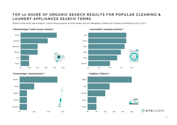 For the Product Visibility Report, SiteLucent looked at the presentation and visibility of products in the Household Laundry & Cleaning appliances segment on online retailers and marketplaces in Germany, Belgium, and the Netherlands. We reveal insights and best practices of leading brands in the segment using our digital shelf data & analytics.
